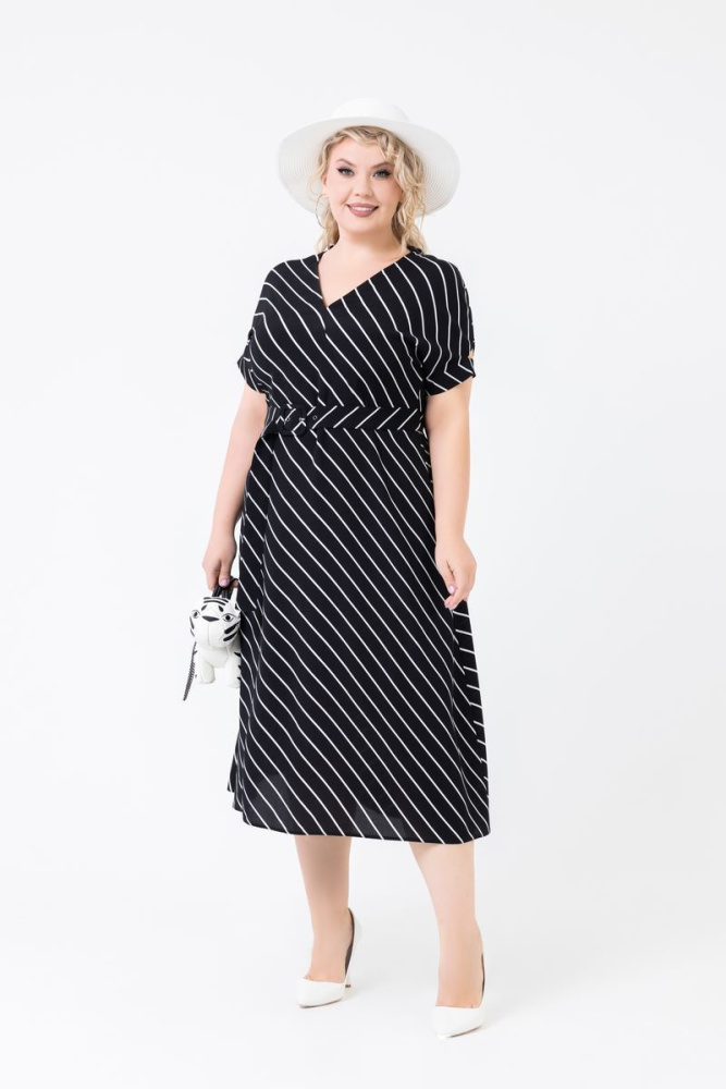 Лиф изделия на запАх. Спущенная линия плеча. Отрезная линия талии. Юбка изделия расклешенная. К платью прилагается пояс из основной ткани.