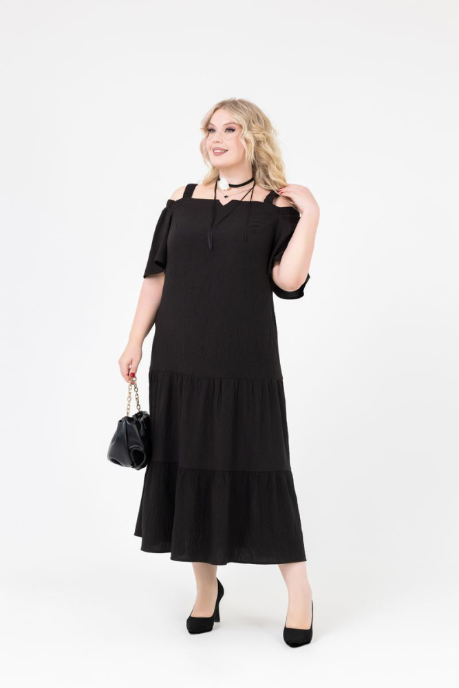 Модель с открытым плечевым поясом, на широких бретелях и с заниженной .линией талии. Рукав короткий.