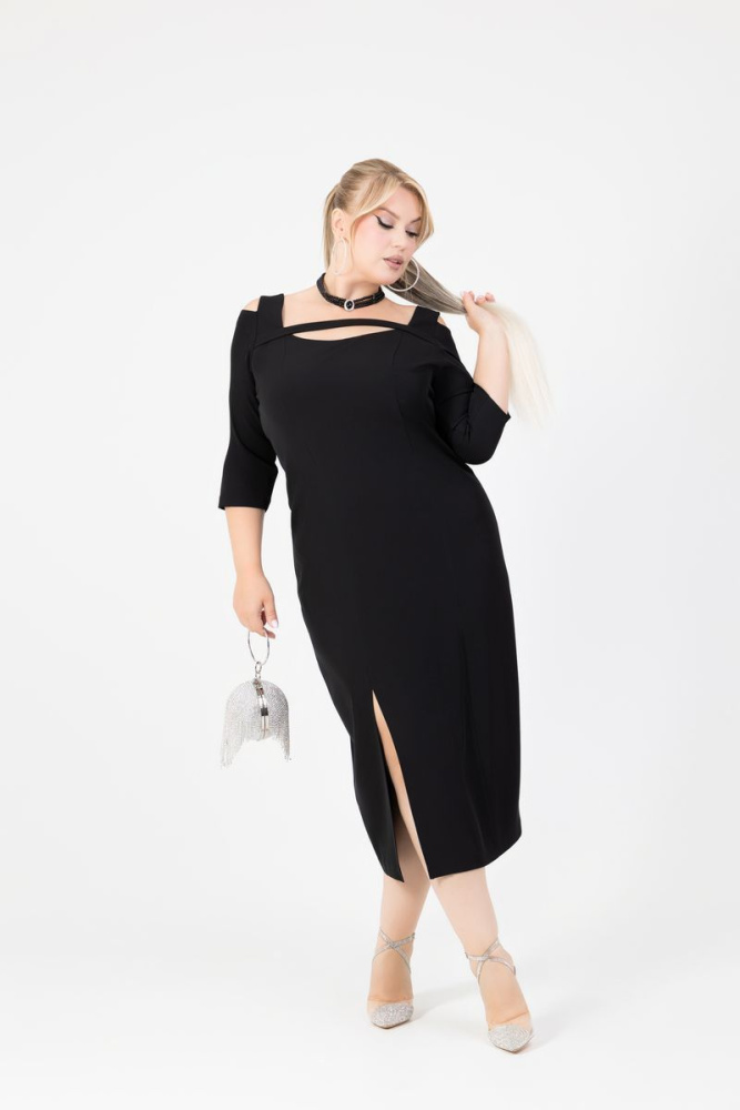Модель полуприлегающего силуэта выполнена из плательного крепа. Вырез горловины «каре». Рукав втачной, длина за локоть. По полочке, внизу, с боку разрез. По спинке серединный шов, таливые вытачки и застёжка на молнию.