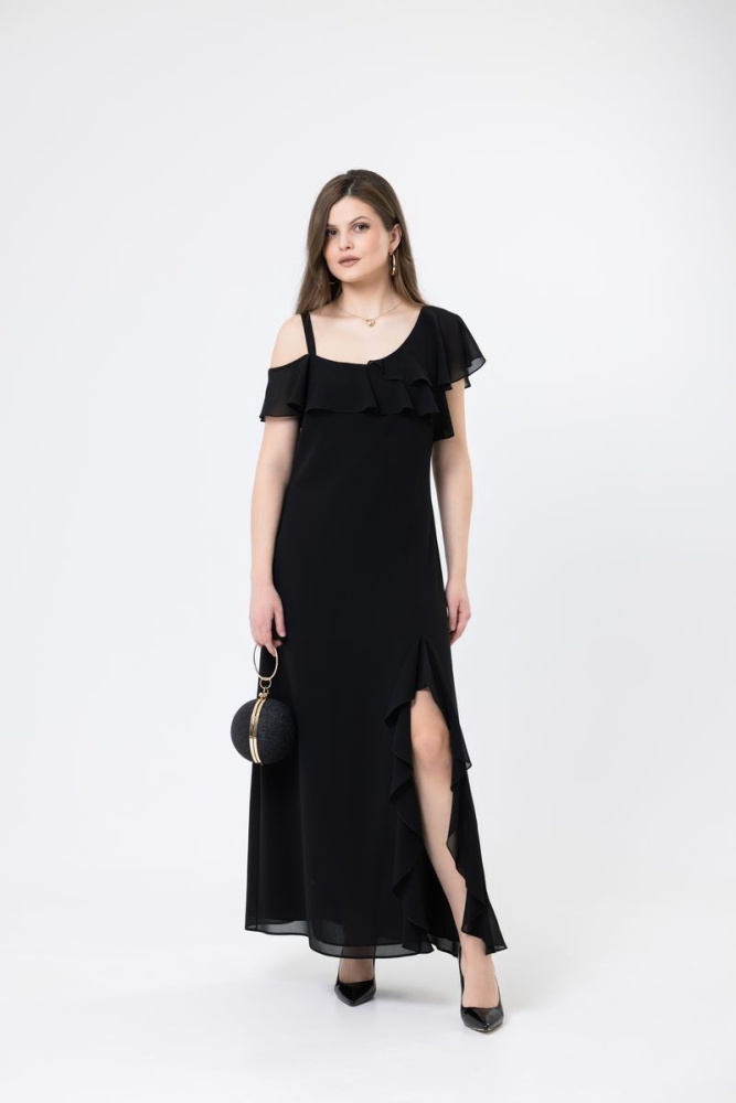 Модель прилегающего силуэта выполнена из двойного слоя шифона. В верхней части изделия асимметричный волан. С левой стороны платья застёжка на потайную молнию и внизу разрез. По спинке средний шов.