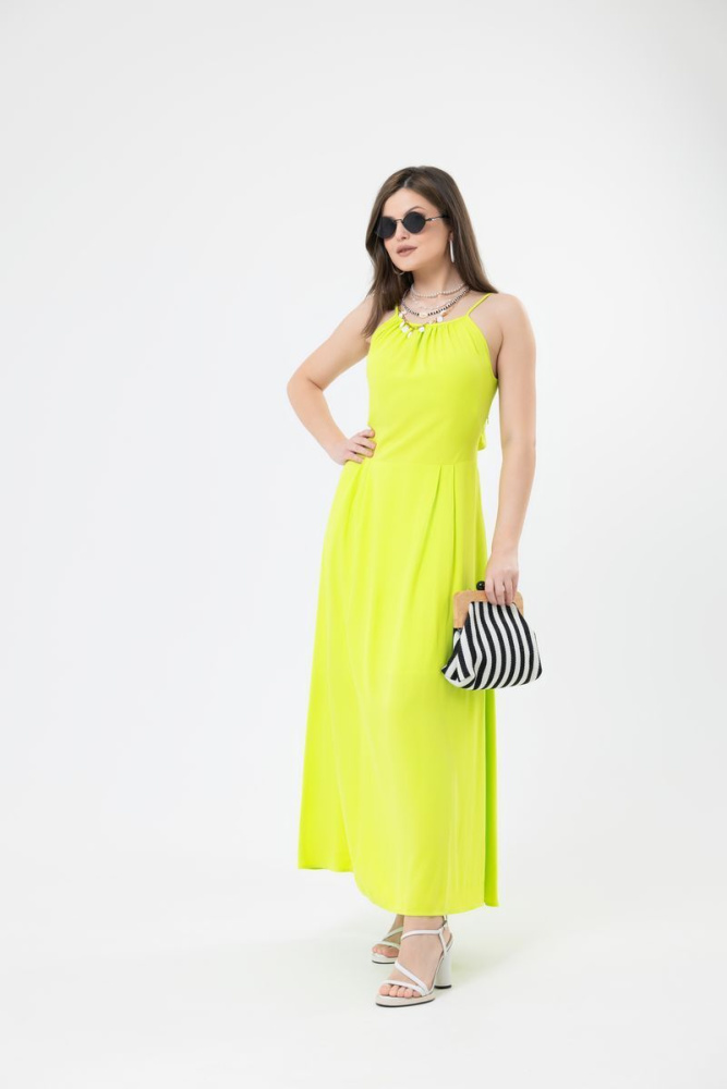 Модель на тонких бретелях, прилегающего силуэта, выполнена из ткани «Belmando». По полочке отрезная линия талии с заложенными складками. Отлетная деталь спинки. Юбка по спинке — на резинке. Изделие на подкладке.