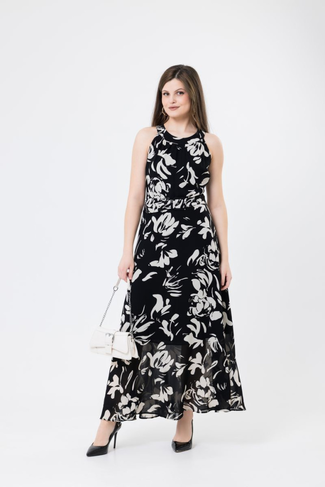 Модель прилегающего силуэта выполнена из шифона. Круглый вырез горловины оформлен планкой. По спинке застёжка на навесные петли. К изделию прилагается съёмный пояс. Платье на подкладке.