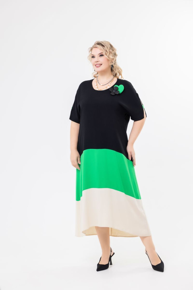 Платье свободного силуэта выполнено из трёх цветов ткани «Belmando». Вырез горловины круглый. Короткий цельнокроеный рукав с разрезом. В боковых швах действующие карманы. Низ изделия фигурный. По спинке средний шов.