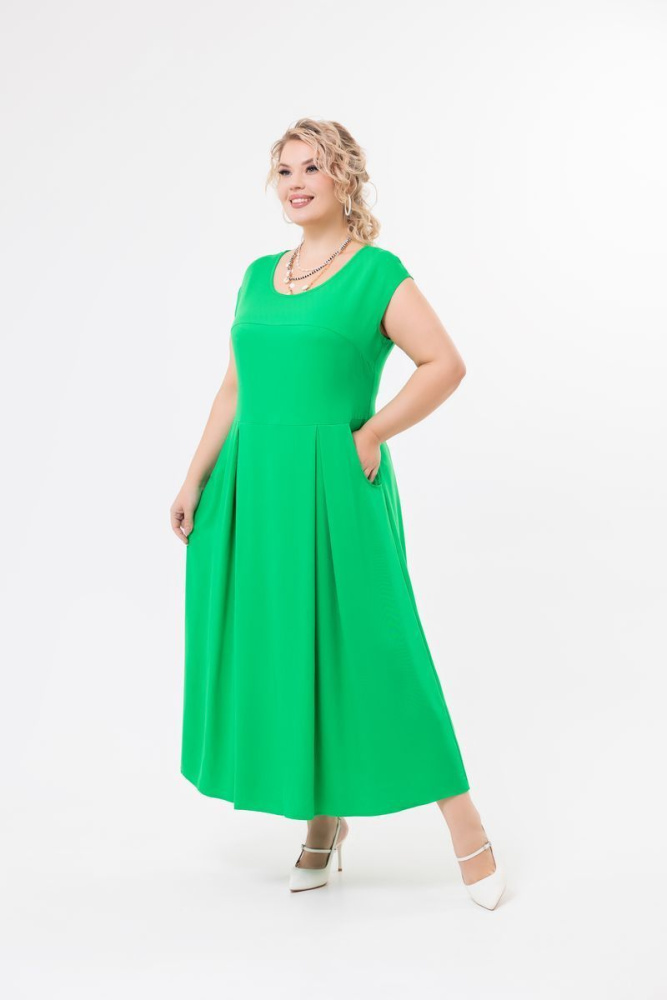 Модель полуприлегающего силуэта с лёгким расклешением выполнена из ткани «Belmando». Вырез горловины круглый. Слегка спущенная линия плеча. По отрезной линии талии заложены складки. Имеются два действующих кармана.