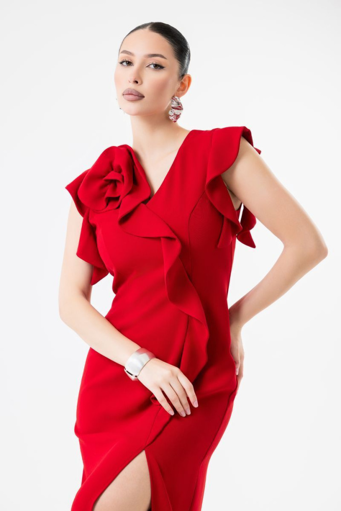Модель приталенного силуэта выполнена из плательного крепа. Вырез горловины V-образный. По полочке втачной волан и декоративное украшение («роза»). С левой стороны глубокий разрез. По спинке талиевые вытачки.