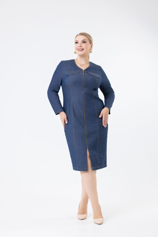 Модель облегающего силуэта выполнена из джинсовой ткани. Вырез горловины V-образный. Рукав втачной, длинный. В верхней части изделия — клапаны. По центру застёжка на молнию. Модель с декоративными отстрочками.