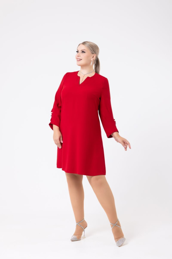 Платье А-силуэта выполнено из креповой ткани Tommy. Вырез горловины круглый с V-образным вырезом. Рукав втачной, со складкой по низу. По спинке средний шов.