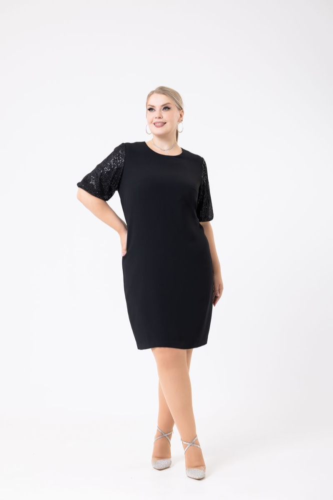 Изделие полуприлегающего силуэта выполнено из ткани Tommy. Вырез горловины округлой формы. Втачной рукав из пайеток.