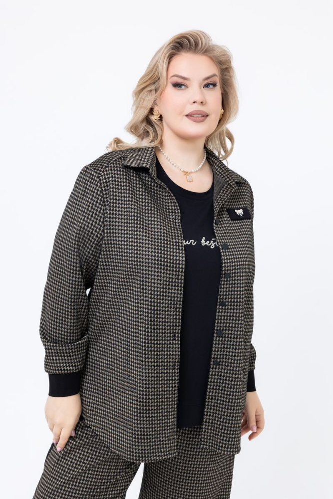 Изделие прямого силуэта, выполнено из трикотажного полотна. Воротник отложной. Рукав втачной, длинный, на манжете. По центру полочки застёжка на пуговицы. В боковых швах разрезы. По спинке — «кокетка».