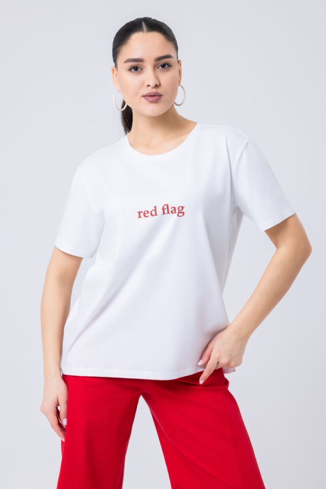 Изделие прямого силуэта выполнено из ткани Full Lycra. Вырез горловины круглый. Рукав втачной, короткий. По центру полочки печать red flag.