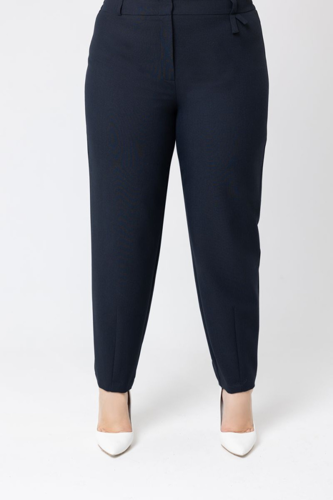 Изделие выполнено из костюмной ткани с добавлением эластана. Пояс по переду фиксированный, по спинке на резинке. По передним половинкам, внизу, вытачки. По задним - «листочки».