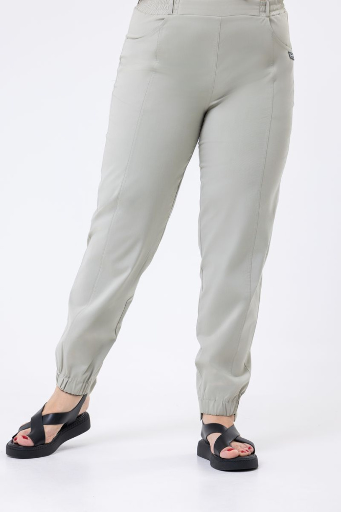 Брюки, слегка зауженные книзу, выполнены из хлопка. Пояс на резинке. Имеются действующие карманы. Низ передних половинок на резинке, по спинке — ровные. По задним половинкам два накладных рабочих кармана.