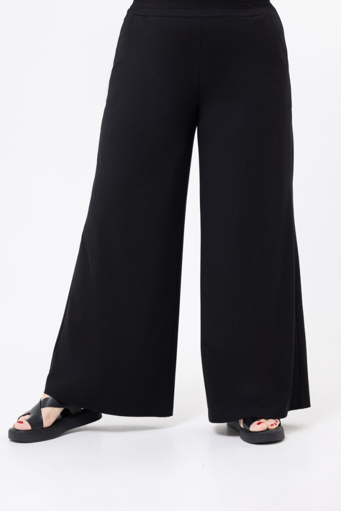 Прямые брюки выполнены из ткани «Modal». Пояс на резинке. Имеются два действующих кармана.