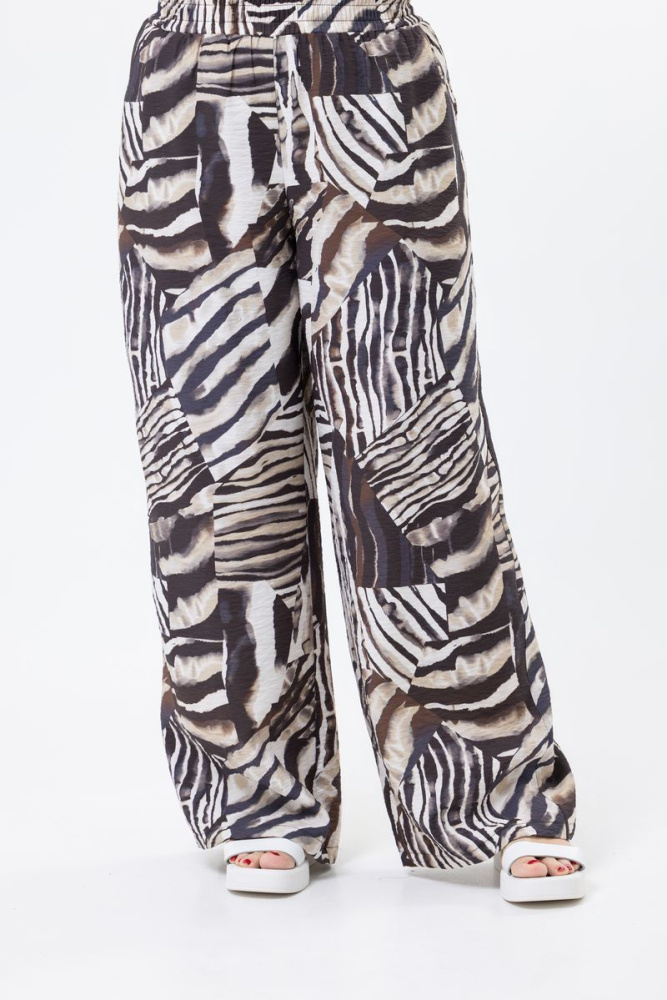 Прямые брюки выполнены из ткани «София». Пояс на резинке. Имеются два действующих кармана.