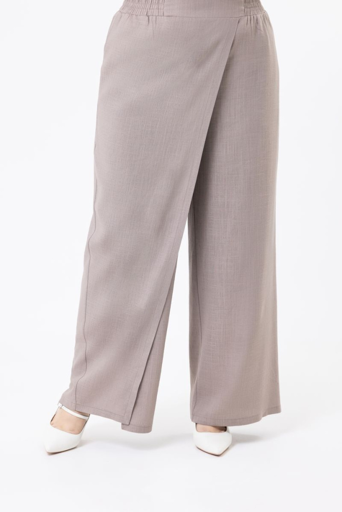 Прямые брюки с «полузапахом» выполнены из льняной ткани. Пояс на резинке. Имеются 2 действующих кармана.