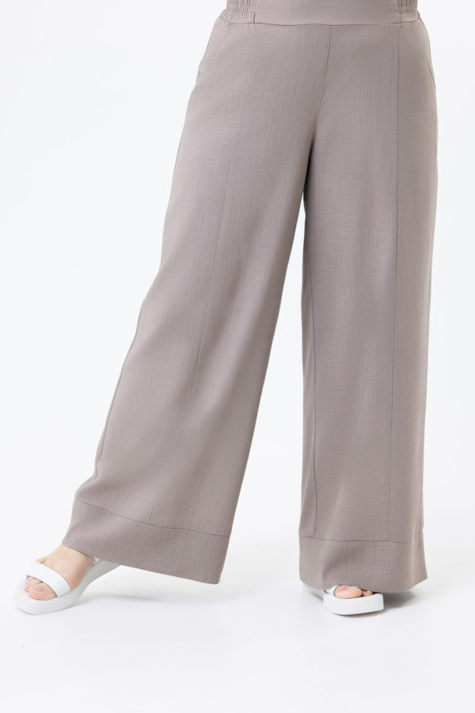 Брюки «Трубы» выполнены из льняной ткани. Пояс на резинке. По центру передних половинок вертикальная отстрочка. По низу изделия широкий манжет. Имеются два действующих кармана.