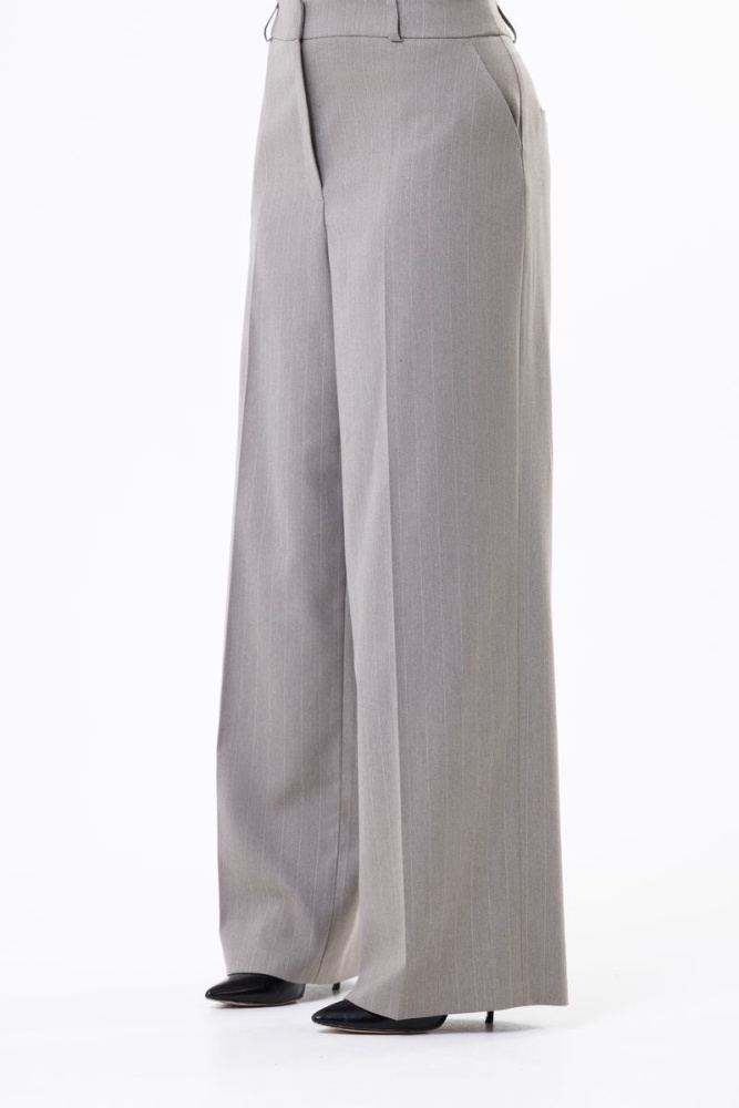 Брюки «Трубы» выполнены из костюмной ткани. Пояс фиксированный. Застёжка на молнию и пуговицу. Имеются 2 действующих кармана.