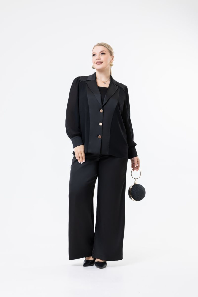 Брюки «Трубы» выполнены из атласа. Пояс на резинке. Карманов нет.
