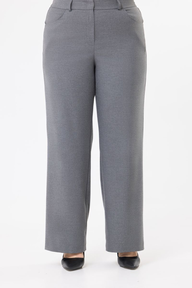 Брюки прямого кроя выполнены из костюмной ткани. Пояс по переду фиксированный, по спинке на резинке. Имеются действующие карманы.