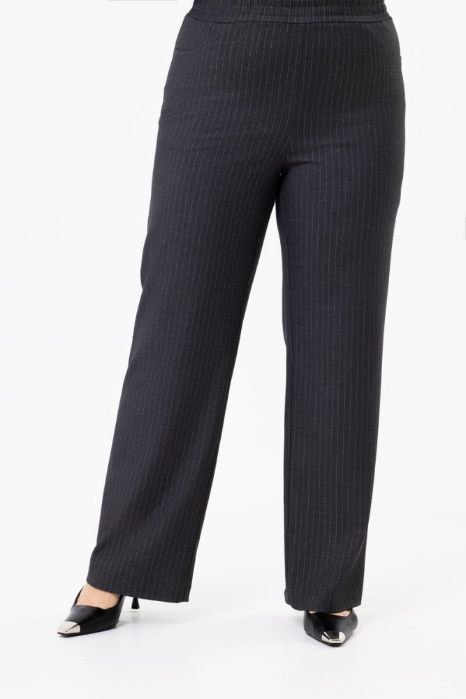 Классические брюки выполнены из костюмной ткани в серую полоску. Пояс на резинке. Имеются два действующих кармана.