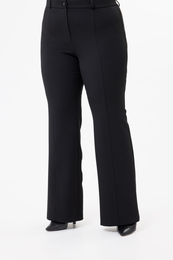 Брюки клёш выполнены из ткани «Габардин Елена». Пояс на резинке. По центру передних половинок отстрочены стрелки. Имеются подрезы. По задним половинкам — листочки.