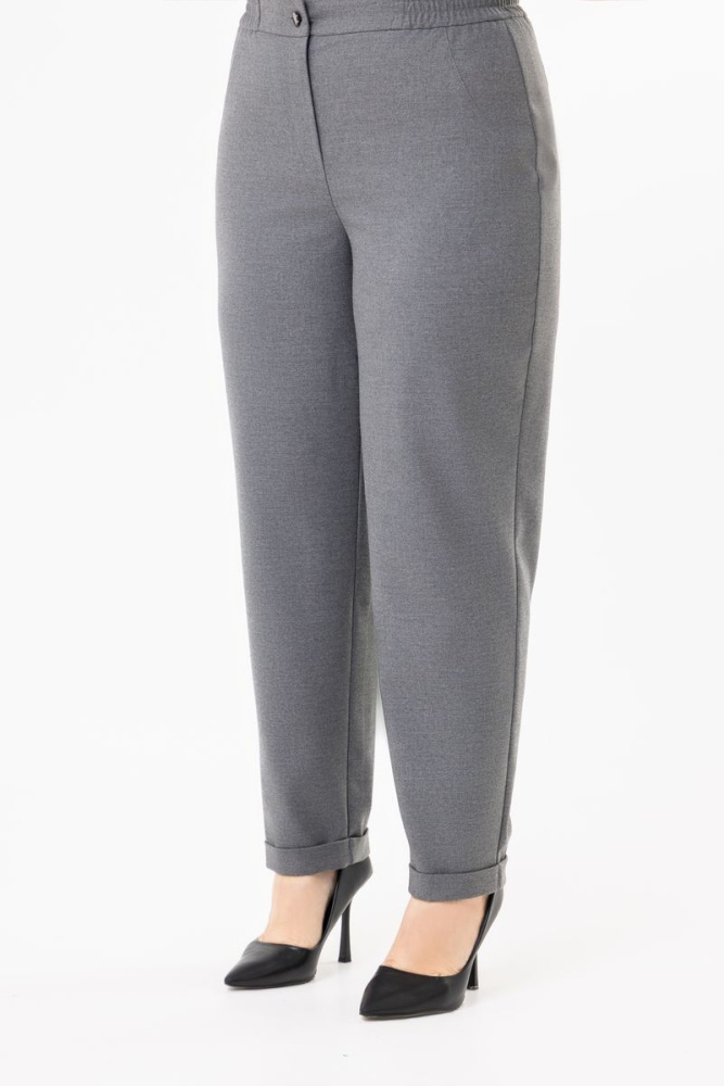 Зауженные брюки выполнены из костюмной ткани. Пояс на резинке. По низу изделия манжеты. Карманов НЕТ.