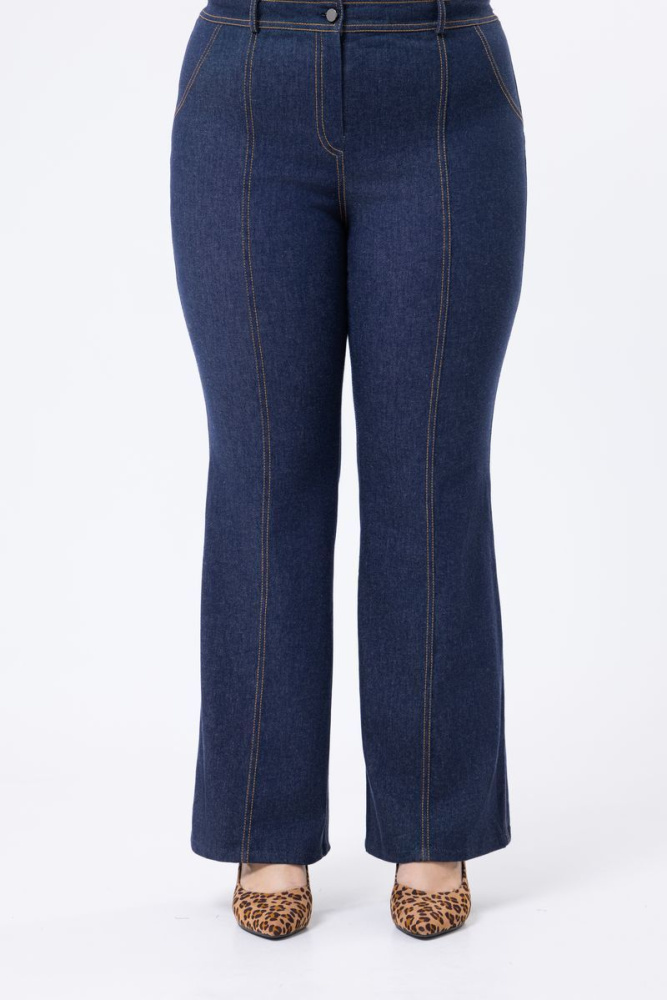 Модель облегающего силуэта, с легким расклешением низа, выполнена из джинсовой ткани. Пояс по переду — фиксированный, по спинке — на резинке. По передним половинкам подрезы и застежка на молнию и пуговицу. Сзади два действующих кармана.