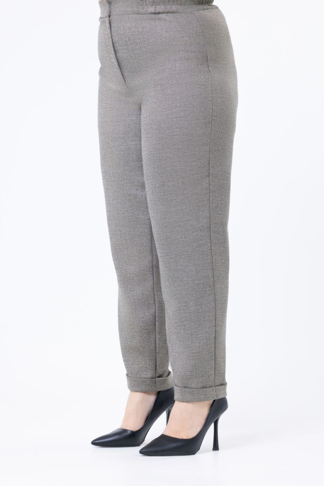 Брюки выполнены из костюмной ткани. Пояс по переду фиксированный, по спинке — на резинке. Застежка на молнию и пуговицу. Имеются два действующих кармана. Низ изделия с отворотом.