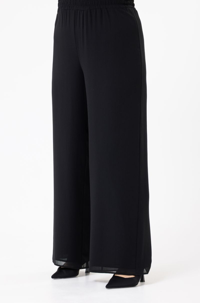 Прямые брюки выполнены из 2-х слоёв плотного шифона. Пояс на резинке. Карманов НЕТ.