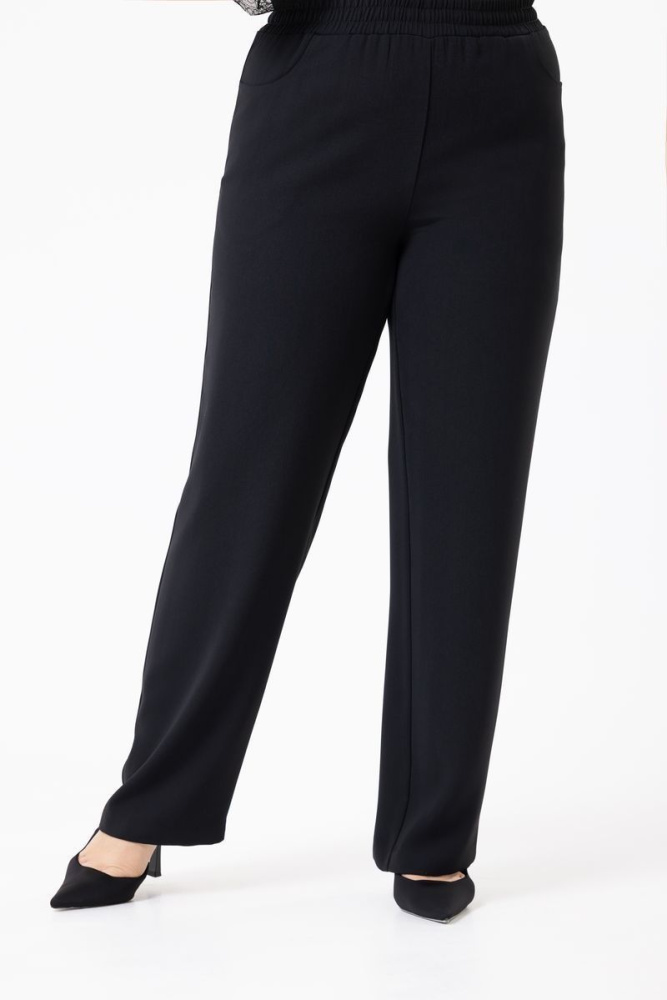 Классические брюки выполнены из креповой ткани Tommy. Пояс вкруговую на резинке. Имеются два действующих кармана.