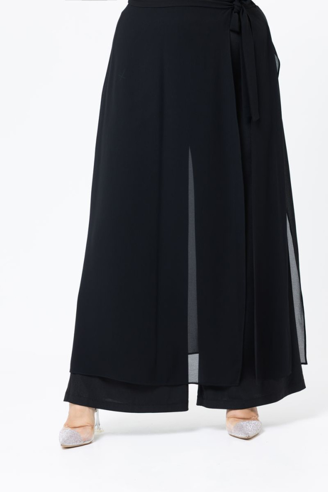 Прямые брюки выполнены из трикотажного полотна (масло) с напылением. Пояс на резинке. Карманов НЕТ. К изделию прилагается юбка с высокими разрезами по бокам и по рельефу полочки. Пояс по спинке на резинке, по переду на завязках.