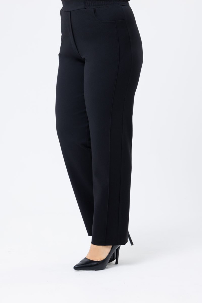 Прямые брюки выполнены из трикотажного полотна. Пояс на резинке. По передним половинкам декоративный гульфик и два действующих кармана.