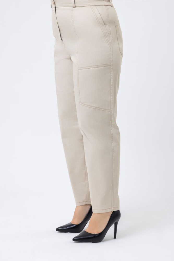 Изделие выполнено из хлопковой ткани. Пояс по переду фиксированный, по спинке на резинке. Застёжка на молнию и пуговицу. Имеются карманы.