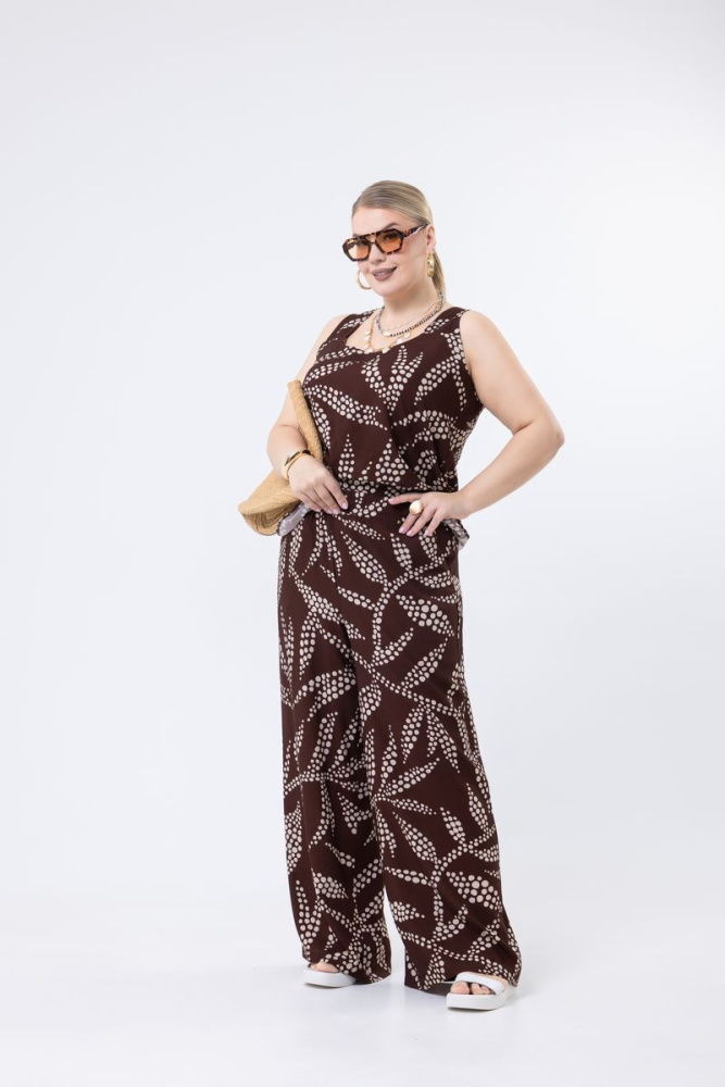 Комплект (топ + брюки) выполнен из ткани «EREZ». Топ силуэта «трапеция». Вырез горловины круглый. Брюки прямого силуэта. Пояс на резинке.