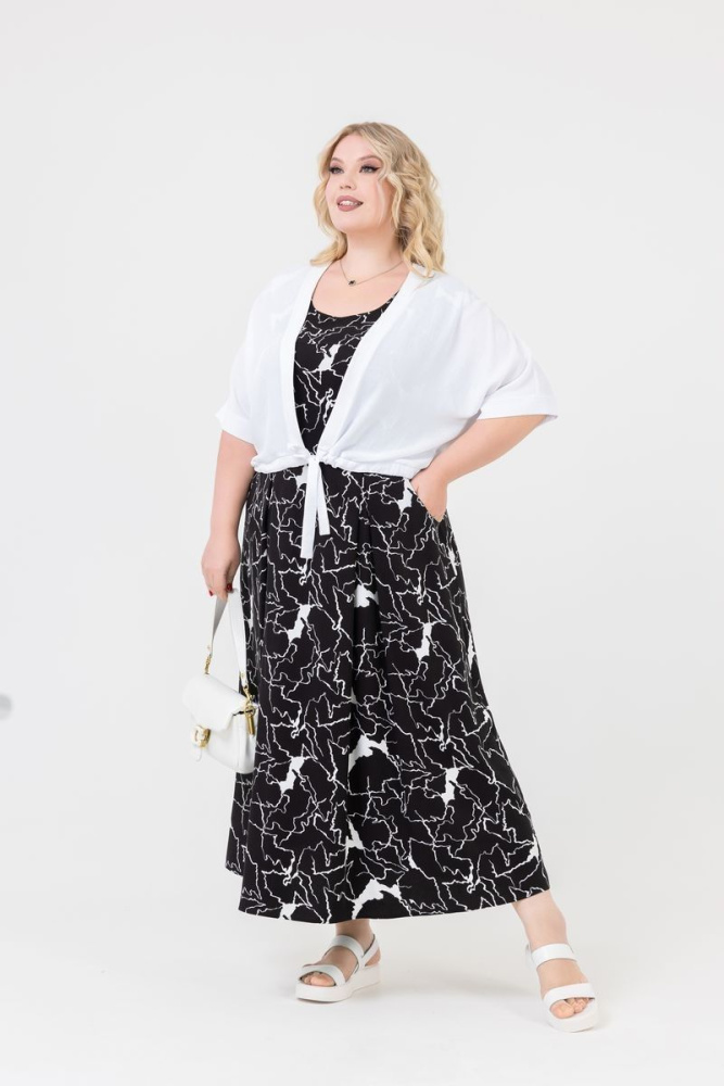Болеро свободного силуэта выполнено из ткани « Манго ». Спущенная линия плеча. Низ изделия на кулиске. Без застёжки.
