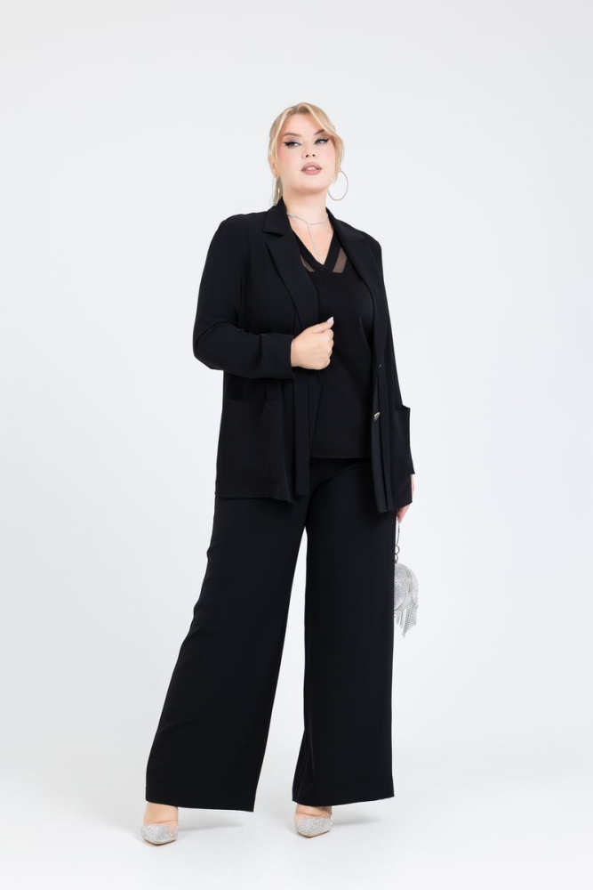 Жакет прямого силуэта выполнен из креповой ткани. Воротник отложной с лацканами. Рукав втачной, длинный. По полочке два действующих кармана и центральная застёжка на пуговицы. Модель без подкладки.