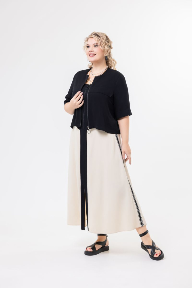 Модель полуприлегающего силуэта выполнена из ткани ”Belmando”. Круглый вырез горловины. Рукав втачной короткий. По центру застёжка на молнию. Без карманов.