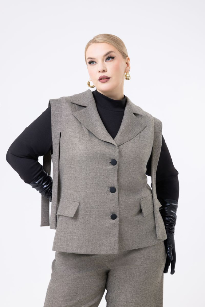 Жилет выполнен из костюмной ткани. Отложной воротник с лацканами. По центру застёжка на пуговицы. По полочке декоративные клапаны. В боковых швах — разрезы.