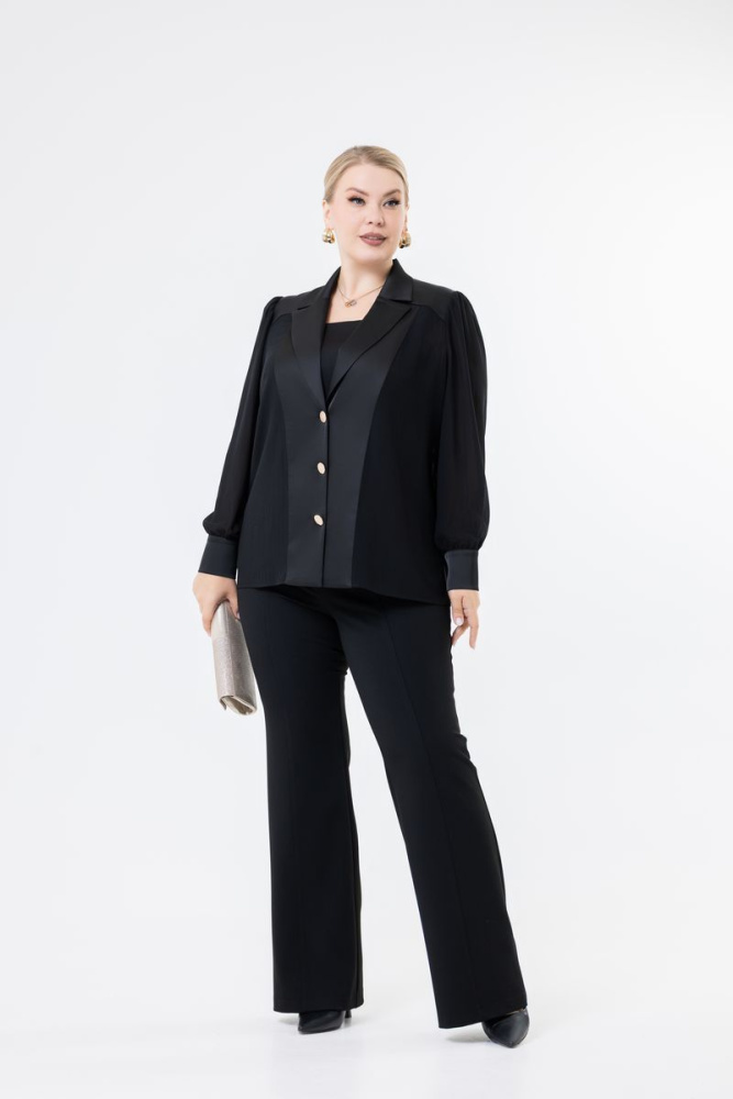 Жакет свободного силуэта выполнен из плотного шифона (сахар). Кокетка по переду и спинке, вставка по центру изделия — из атласа. Отложной воротник с лацканами. Рукава втачные, длинные, на манжете. Застёжка по центру на пуговицы.
