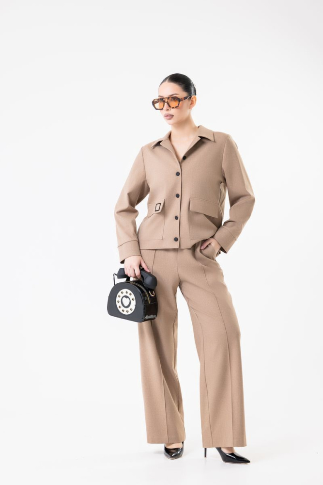 Куртка прямого силуэта выполнена из костюмной ткани. Воротник отложной. Рукава втачные, длинные. По полочке два накладных рабочих кармана с клапанами. Низ рукавов и изделия на манжете.