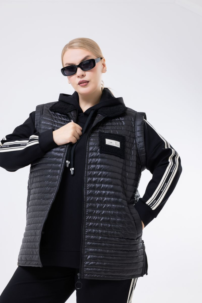 Жилет прямого силуэта. Застежка на молнию. В боковых швах небольшие разрезы на молнии. Карманы действующие.