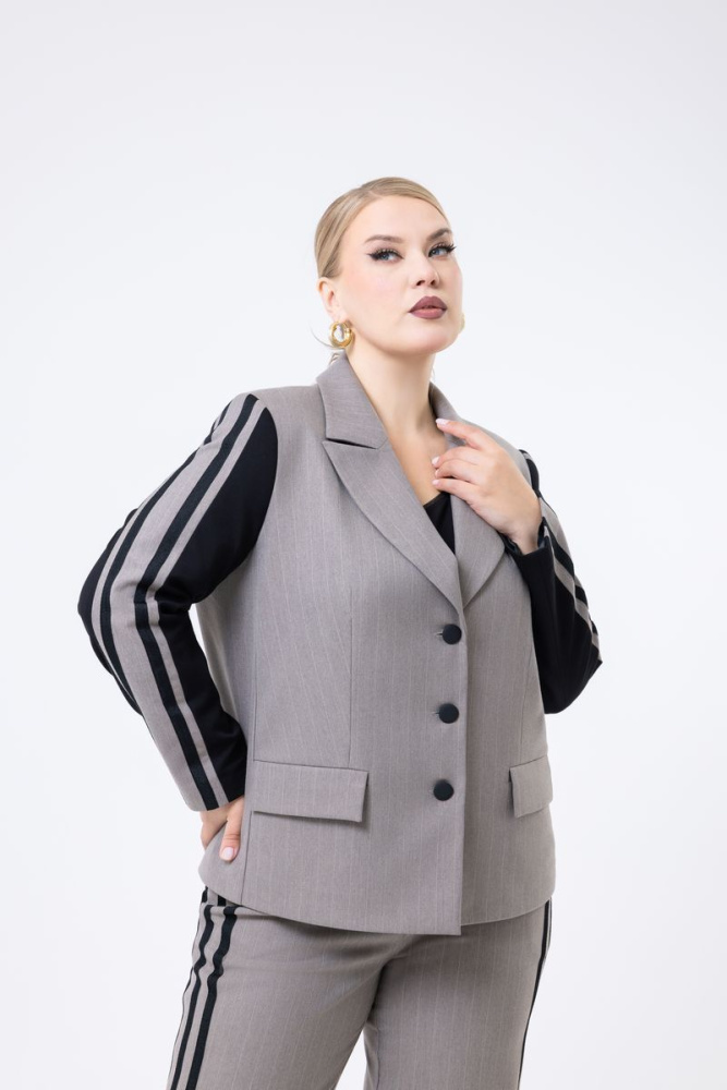 Жакет полуприлегающего силуэта выполнен из двух видов ткани (костюмная ткань + трикотаж черный). Воротник пиджачного типа. Рукав втачной, длинный. По центру застежка на три пуговицы. Жакет с плечевыми накладками. Изделие на подкладе.