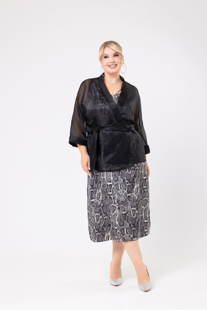 Жакет свободного силуэта выполнен из органзы. V-образный вырез горловины. Рукав цельнокроенный. Изделие дополнено съемным поясом.