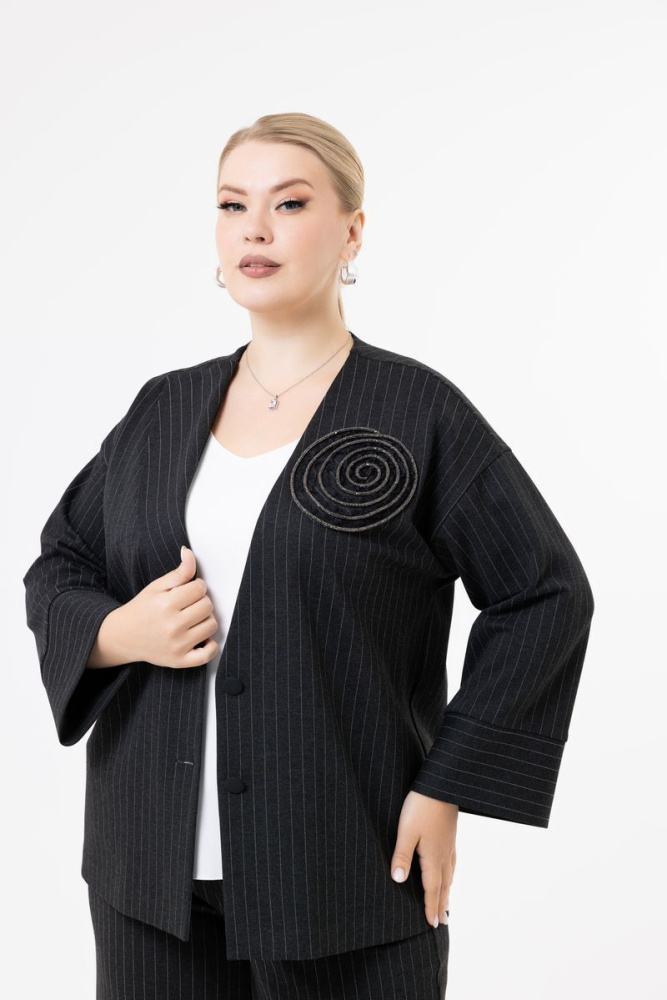 Жакет прямого силуэта выполнен из трикотажного полотна. Спущенная линия плеча. Длинный рукав, низ на широкой манжете. По центру изделия застёжка на пуговицы. Изделие дополнено украшением (роза).