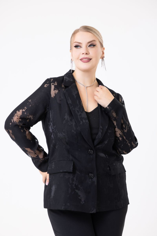 Модель прямого силуэта выполнена из полупрозрачной органзы с digital обработкой. Воротник пиджачного типа. Рукав втачной, длинный. По полочке — клапаны. Изделие без подкладки.