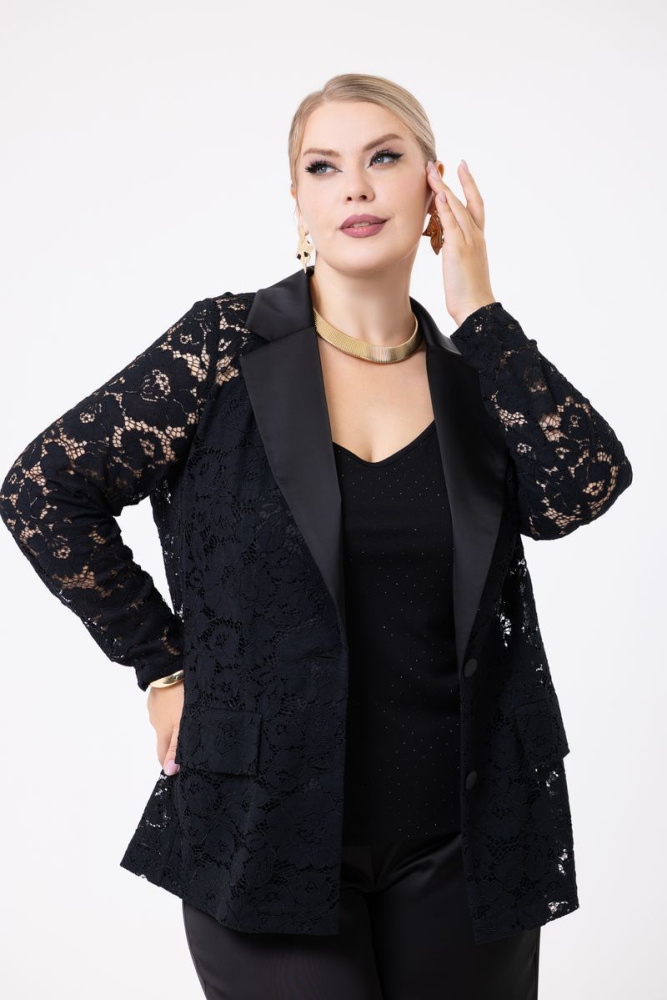Модель облегающего силуэта выполнена из гипюра. Воротник с лацканами пиджачного типа из атласа. Рукав втачной, длинный. По полочке — клапаны.