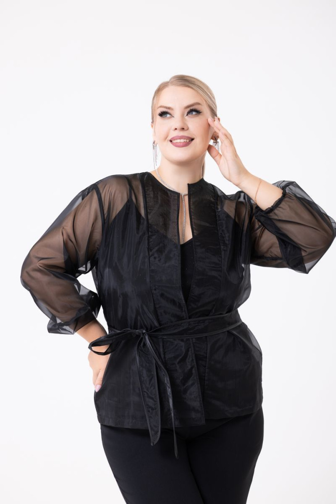 Модель свободного силуэта выполнена из органзы. Вырез горловины круглый. Спущенная линия плеча. Длинный рукав, низ оформлен на резинку. Жакет дополнен съёмным поясом.