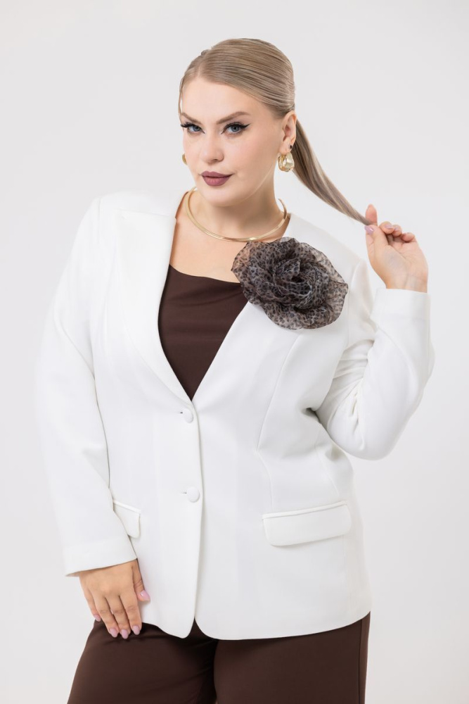 Жакет прямого силуэта выполнен из ткани «Морчание». Углублённый V-образный вырез горловины с асимметричным лацканом. По полочке действующие карманы с клапаном. Застёжка на пуговицы. Изделие на подкладке.