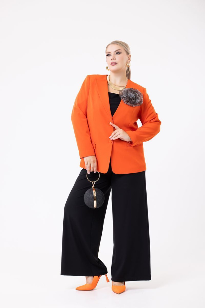 Жакет прямого силуэта выполнен из ткани «Морчание». Углубленный V-образный вырез горловины с асимметричным лацканом. По полочке действующие карманы с клапаном. Застёжка на пуговицы. Изделие на подкладке. Жакет дополнен украшением «Роза» под № 173068.