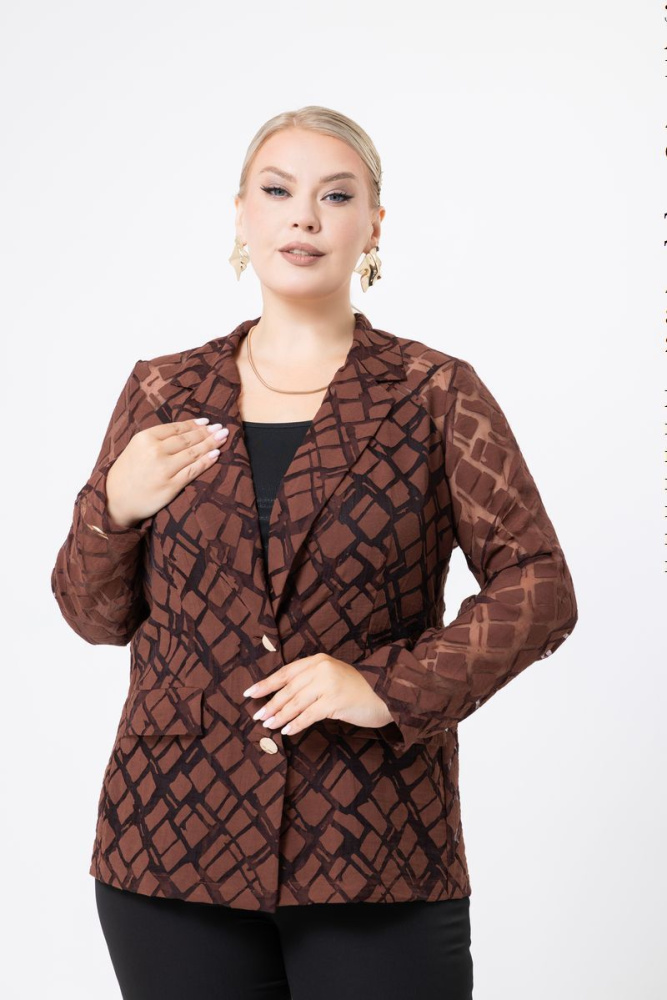 Модель прямого силуэта выполнена из полупрозрачной органзы. Воротник пиджачного типа. Рукав втачной, длинный. По полочке клапаны. Жакет без подкладки.